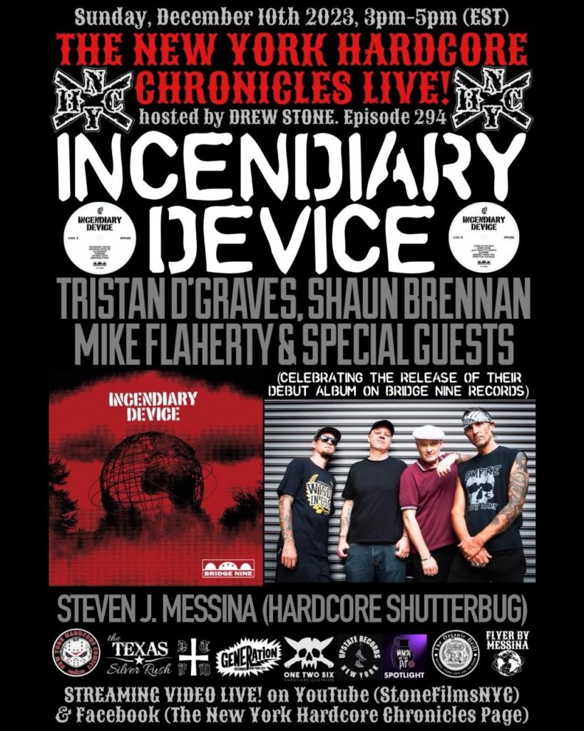 The New York Hardcore Chronicles & New York Hard Core Comics, Alongside Organic Grill , DTFM Vinyl, One Two Six Clothing, Generation Records, Upstate Records INC, & The Texas Silver Rush Proudly Present, The New York Hardcore Chronicles LIVE Show! Hosted By Drew Stone With Today’s Show Guest’s Incendiary Device Tristan D’Graves, Shaun Brennan, Mike Flaherty & Special Guests: Chris Wrenn Of Bridge Nine Records & Producer Neal “Zum” Ostberg Of Fryette Amplification & More! Regular Show Segments; “Picture Of The Day” With Steven “Hardcore Shutterbug” Messina & “The Women Of The Pit Spotlight” Featuring Bands From Around The World! Streaming LIVE On Facebook & YouTube At “STONEFILMSNYC”! Tune In For A Great Time With Some Of The Pioneers Of NYHC!