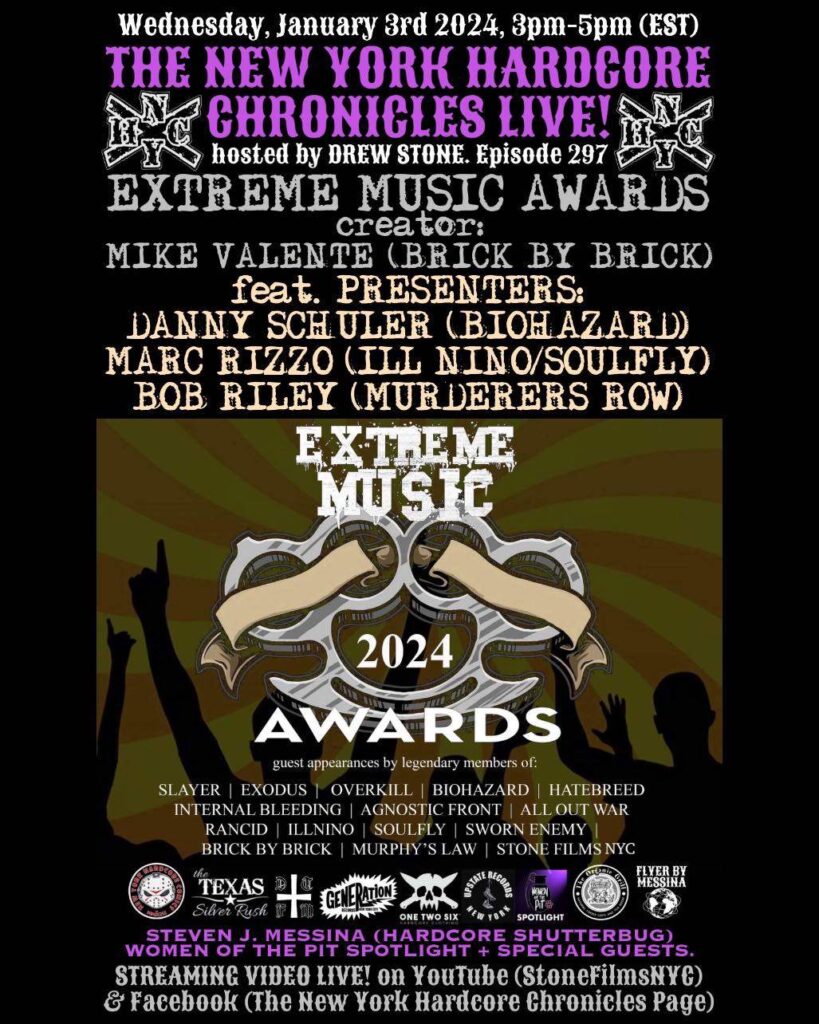 The New York Hardcore Chronicles & New York Hard Core Comics, Alongside Organic Grill , DTFM Vinyl, One Two Six Clothing , Generation Records, Upstate Records INC, & The Texas Silver Rush Proudly Present, The New York Hardcore Chronicles LIVE Show! Hosted By Drew Stone With Today’s Guest Mike Valente @ValenteBXB Of Brick By Brick @BrickByBrickhc & Creator Of The “Extreme Music Awards” @ExtremeMusicAwards!