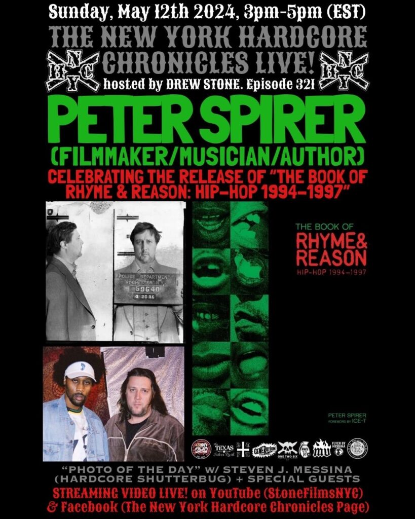 The New York Hardcore Chronicles & New York Hard Core Comics, Alongside Organic Grill, DTFM Vinyl, One Two Six Clothing, Generation Records, Madd Vintage & The Texas Silver Rush Proudly Present, The New York Hardcore Chronicles LIVE Show! Hosted By Drew Stone With Today’s Guest Filmmaker, Musician, Author Peter Spirer! Celebrating The Release Of “The Book Of Rhyme & Reason : Hip-Hop 1994-1997”! Regular Show Segments; “Picture Of The Day” With Steven “Hardcore Shutterbug” Messina & “The Women Of The Pit Spotlight” Featuring Bands From Around The World! Streaming LIVE On Facebook & YouTube At “STONEFILMSNYC”! Tune In For A Great Time With Some Of The Pioneers Of NYHC!