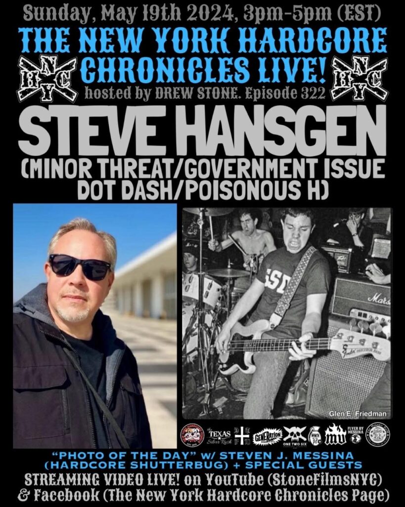 The New York Hardcore Chronicles & New York Hard Core Comics, Alongside Organic Grill , DTFM Vinyl, One Two Six Clothing, Generation Records, Madd Vintage, & The Texas Silver Rush Proudly Present, The New York Hardcore Chronicles LIVE Show! Hosted By Drew Stone With Today’s Guest, Steve Hansgen Of Minor Threat, Second Wind, Government Issue, Dot Dash & Poisonous H! Regular Show Segments; “Picture Of The Day” With Steven “Hardcore Shutterbug” Messina & “The Women Of The Pit Spotlight” Featuring Bands From Around The World! Streaming LIVE On Facebook & YouTube At “STONEFILMSNYC”! Tune In For A Great Time With Some Of The Pioneers Of NYHC!