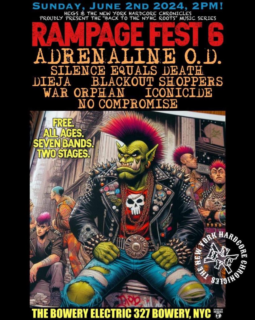 The New York Hardcore Chronicles Proudly Presents “The Back To The NYHC ROOTS” Music Series “RAMPAGE FEST VI” An All Ages FREE Show! Two Stages, Seven Bands Sunday Matinee On The Bowery, Come Out For Music, Art, Culture & A Great Day! Always Support The Scene! Thank You