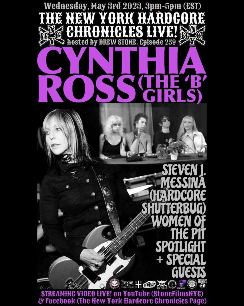 The New York Hardcore Chronicles Page & New York Hard Core Comics, Alongside Organic Grill , Grunge & Grime ., @DiWulf Publishing House , Chachos Tacos , DTFM Vinyl Distro , ONE TWO SIX Hardcore clothing , Upstate Records , Generation Records & @TheTexas Silver Rush Proudly Present, The New York Hardcore Chronicles LIVE Show! Hosted By Drew Stone & With Today’s Guest Cynthia Ross Of The ‘B’ Girls! Regular Show Segments; “Picture Of The Day” With Steven “Hardcore Shutterbug” Messina, “Questions Of The Week” With Chucky Brown & Women Of The Pit With The “Spotlight” In Today’s Hardcore! Streaming LIVE On Facebook & YouTube At “STONEFILMSNYC”! Tune In For A Great Time With Some Of The Pioneers Of NYHC!
