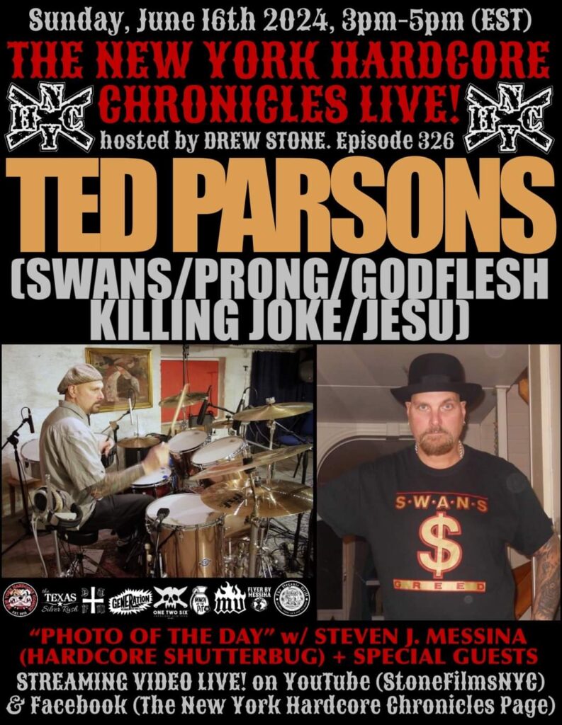 The New York Hardcore Chronicles & New York Hard Core Comics, Alongside Organic Grill, DTFM Vinyl, One Two Six Clothing, Madd Vintage, Generation Records, & The Texas Silver Rush Proudly Present, The New York Hardcore Chronicles LIVE Show! Hosted By Drew Stone With Today’s Guest, Ted Parsons Of Swans, Prong, Godflesh, Killing Joke & Jesu! Regular Show Segments; “Picture Of The Day” With Steven “Hardcore Shutterbug” Messina & “The Women Of The Pit Spotlight” Featuring Bands From Around The World! Streaming LIVE On Facebook & YouTube At “STONEFILMSNYC”! Tune In For A Great Time With Some Of The Pioneers Of NYHC!