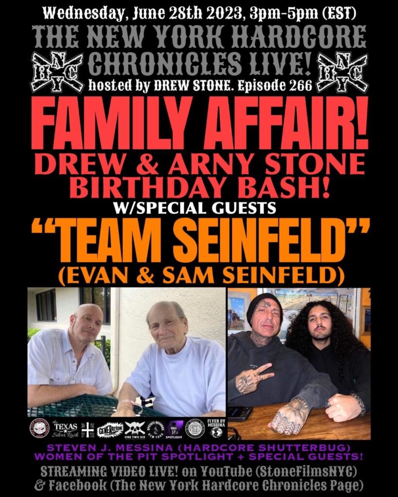 The New York Hardcore Chronicles Page & New York Hard Core Comics, Alongside Organic Grill , DTFM Vinyl Distro , ONE TWO SIX Hardcore clothing , Upstate Records , Generation Records & The Texas Silver Rush Proudly Present, The New York Hardcore Chronicles LIVE Show! Hosted By Drew Stone & Arny Stone For Their Birthday Bash Show, Along With Special Guest’s Evan & Sam Seinfeld Of “Team Seinfeld”! Regular Show Segments; “Picture Of The Day” With Steven “Hardcore Shutterbug” Messina, “Question’s Of The Week” With Chucky Brown & Women Of The Pit With The “Spotlight” In Today’s Hardcore! Streaming LIVE On Facebook & YouTube At “STONEFILMSNYC”! Tune In For A Great Time With Some Of The Pioneers Of NYHC!