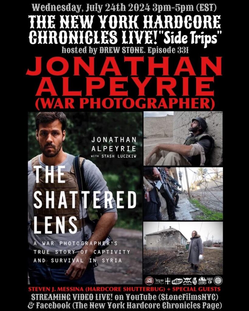 The New York Hardcore Chronicles & New York Hard Core Comics, Alongside Organic Grill, DTFM Vinyl, One Two Six Clothing, Madd Vintage, Generation Records, & The Texas Silver Rush Proudly Present, The New York Hardcore Chronicles LIVE Show “Side Trips’! Hosted By Drew Stone With Today’s Guest, War Photographer Jonathan Alpeyrie Of The Shattered Lens: A War Photographer’s True Story Of Captivity And Survival In Syria. Regular Show Segments; “Picture Of The Day” With Steven “Hardcore Shutterbug” Messina & “The Women Of The Pit Spotlight” Featuring Bands From Around The World! Streaming LIVE On Facebook & YouTube At “STONEFILMSNYC”! Tune In For A Great Time With Some Of The Pioneers Of NYHC!