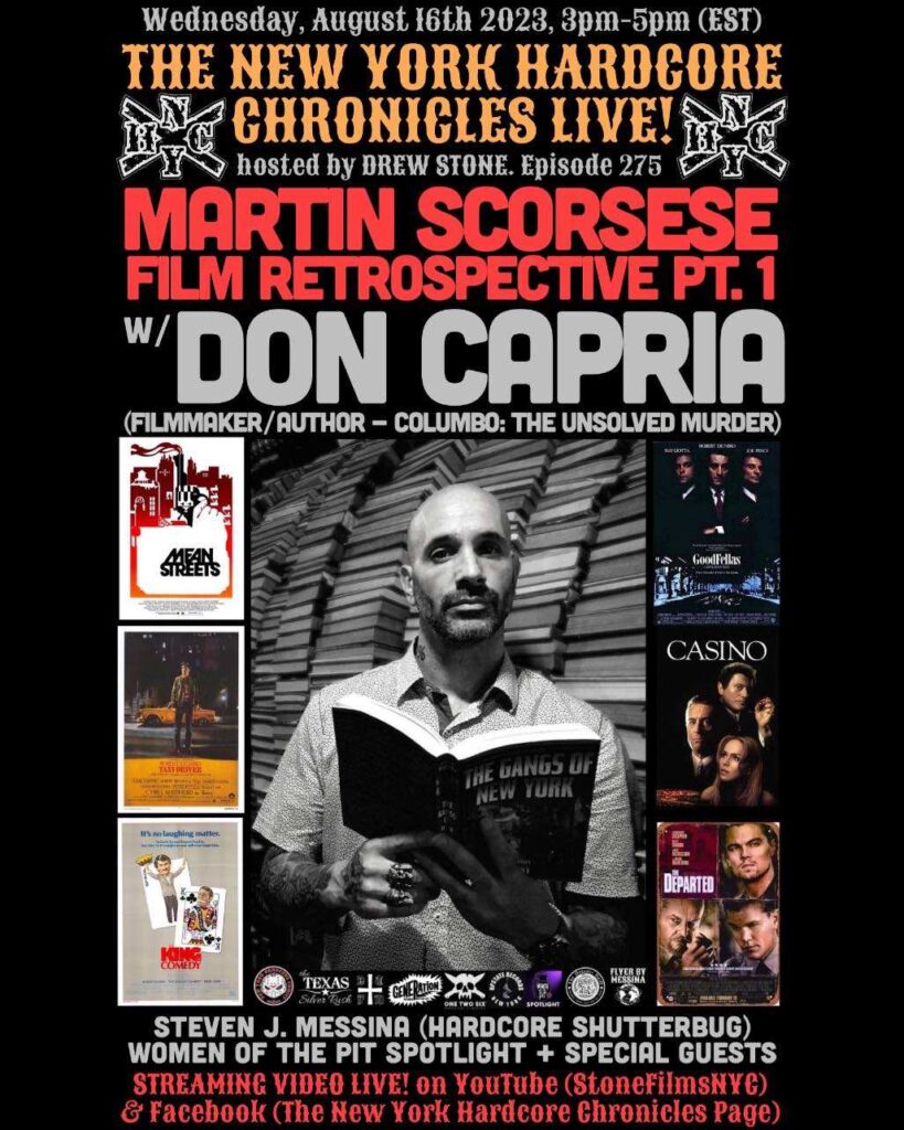 The New York Hardcore Chronicles & New York Hard Core Comics, Alongside Organic Grill , Upstate Records INC , DTFM Vinyl, One Two Six Clothing, Generation Records & The Texas Silver Rush Proudly Present, The New York Hardcore Chronicles LIVE Show! Hosted By Drew Stone With Today’s Show, A Martin Scorsese Film Retrospective Pt. 1 With, Don Capria Filmmaker & Author Of Columbo : The Unsolved Murder! Regular Show Segments; “Picture Of The Day” With Steven “Hardcore Shutterbug” Messina, Question’s Of The Week” With Chucky Brown & Women Of The Pit With The “Spotlight” In Today’s Hardcore! Streaming LIVE On Facebook & YouTube At “@STONEFILMSNYC”! Tune In For A Great Time With Some Of The Pioneers Of NYHC!