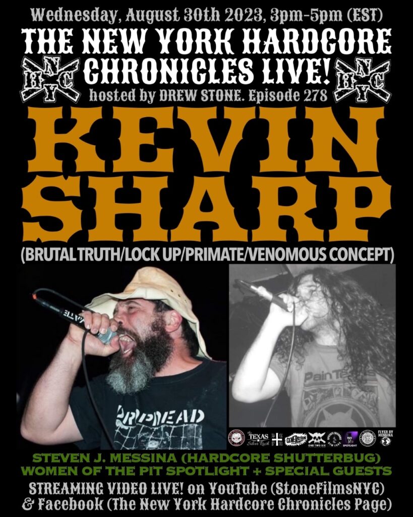 The New York Hardcore Chronicles & New York Hard Core Comics, Alongside Organic Grill , Upstate Records INC , DTFM Vinyl, One Two Six Clothing, Generation Records & The Texas Silver Rush Proudly Present, The New York Hardcore Chronicles LIVE Show! Hosted By Drew Stone With Today’s Guest Kevin Sharp Of Brutal Truth, Lock Up, Primate & Venomous Concept! Regular Show Segments; “Picture Of The Day” With Steven “Hardcore Shutterbug” Messina & Women Of The Pit With The “Spotlight” In Today’s Hardcore! Streaming LIVE On Facebook & YouTube At “STONEFILMSNYC”! Tune In For A Great Time With Some Of The Pioneers Of NYHC! Thank You!