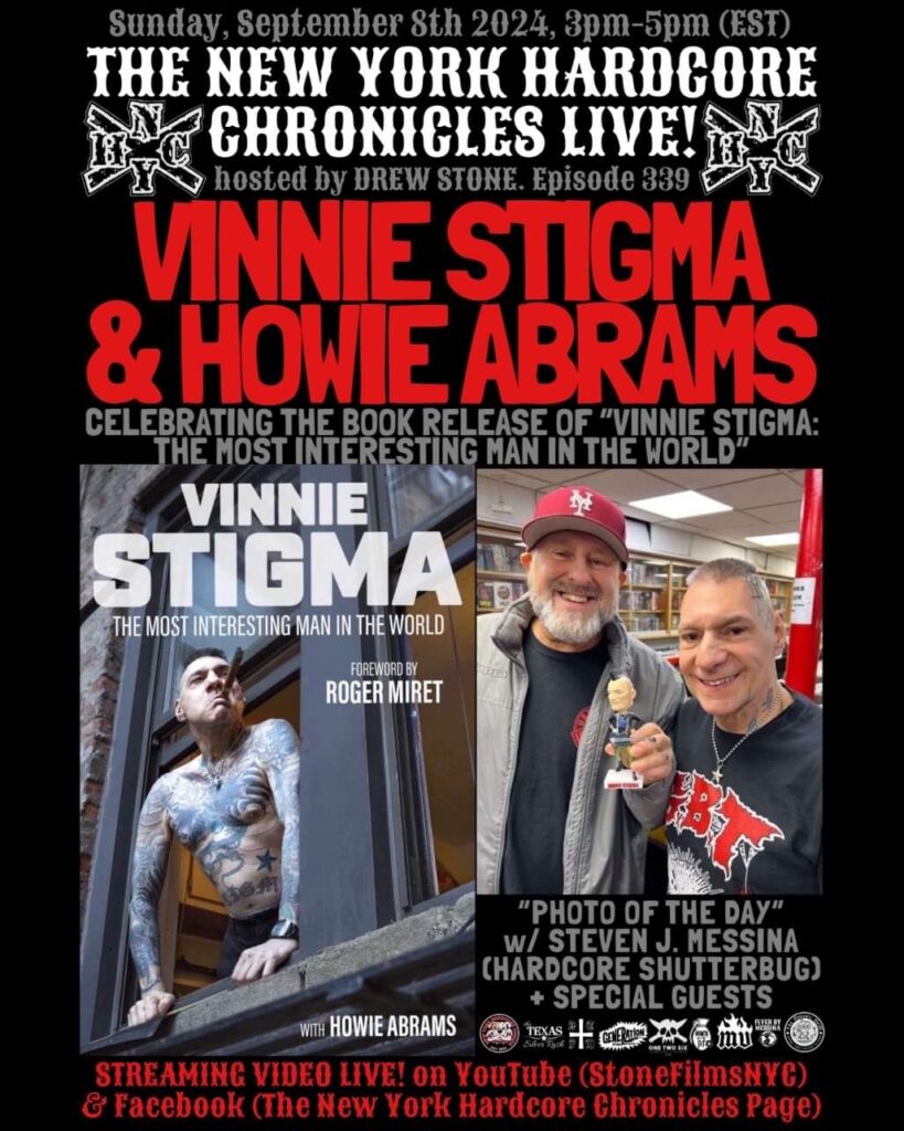 The New York Hardcore Chronicles & New York Hard Core Comics, Alongside, DTFM Vinyl, One Two Six Clothing, Generation Records, Madd Vintage & The Texas Silver Rush Proudly Present, The New York Hardcore Chronicles LIVE Show! Hosted By Drew Stone With Today’s Guest’s, Vinnie Stigma Of Agnostic Front & Howie Abrams Celebrating The Book Release Of “Vinnie Stigma: The Most Interesting Man In The World”! Regular Show Segments; “Picture Of The Day” With Steven “Hardcore Shutterbug” Messina & “The Women Of The Pit Spotlight” Featuring Bands From Around The World! Streaming LIVE On Facebook & YouTube At “STONEFILMSNYC”! Tune In For A Great Time With Some Of The Pioneers Of NYHC!